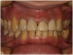 歯が黄色くて汚れが気になるということで来院された患者様です。出来るだけ白くて綺麗な歯にしたいという患者様の要望でオールセラミッククラウンを用いて審美性を重要し、回復したケースです。